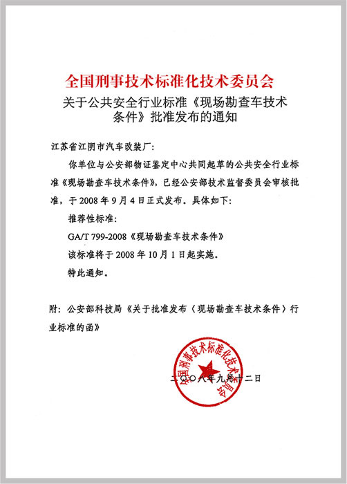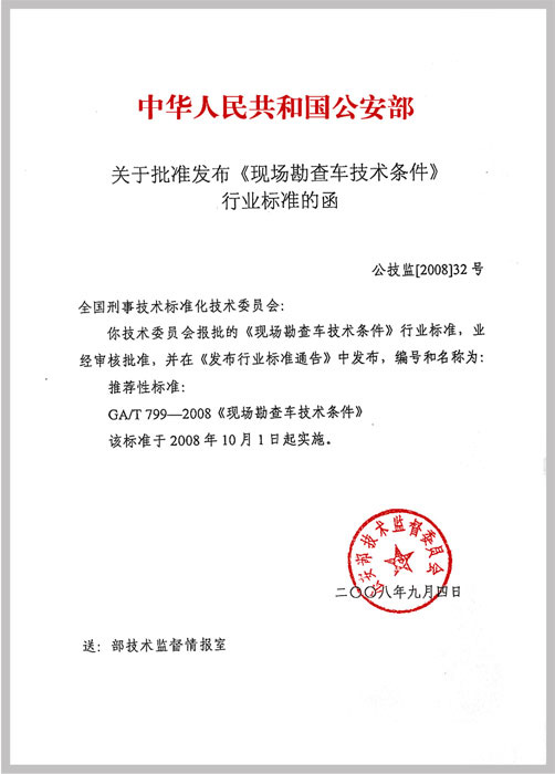 | 由我單位與公安部物證鑒定中心共同起草的公共安全行業(yè)標(biāo)準(zhǔn)《現(xiàn)場勘查車技術(shù)條件》,已經(jīng)公安部技術(shù)監(jiān)督委員會(huì)審核批準(zhǔn),于2008年10月1日起實(shí)施。 推薦標(biāo)準(zhǔn)為GA/T799-2008《現(xiàn)場勘查車技術(shù)條件》。 |